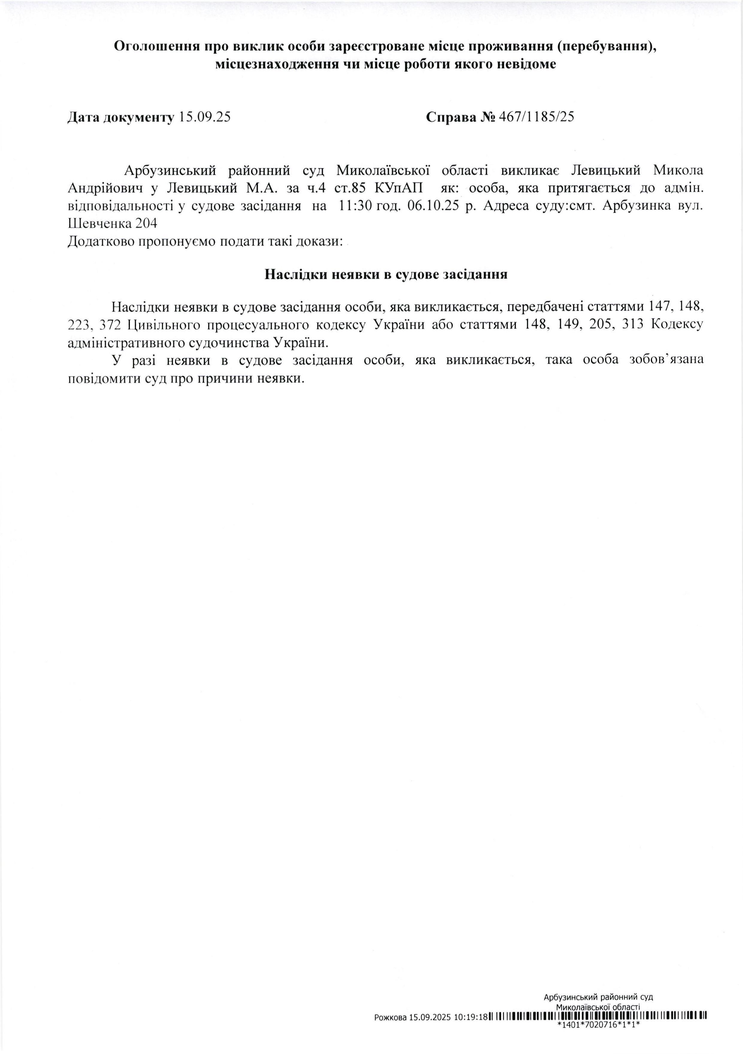 Оголошення про виклик Левицький Микола Андрійович