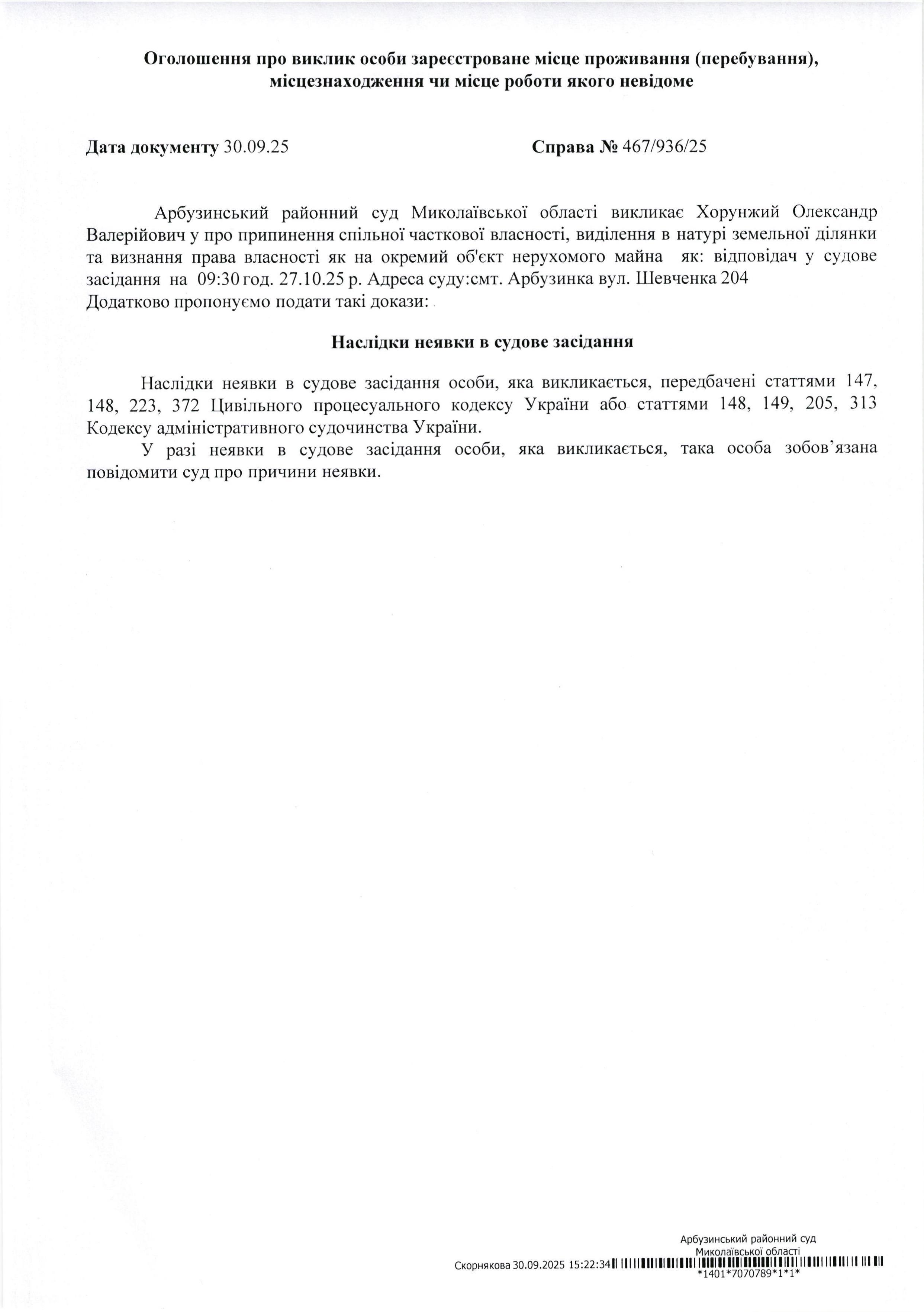 Оголошення про виклик Хорунжий Олександр Валерійович