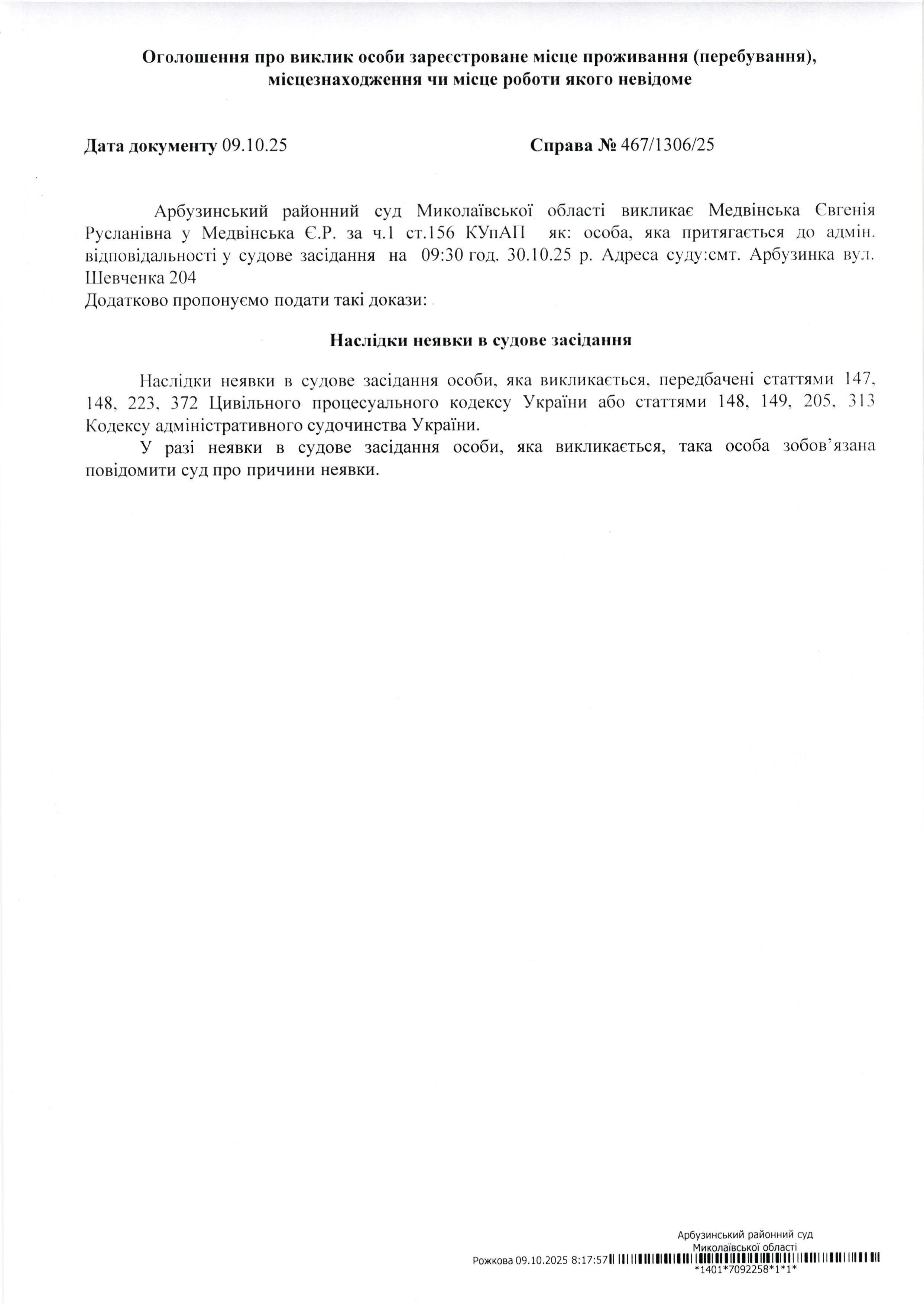 Оголошення про виклик Медвінська Євгенія Русланівна
