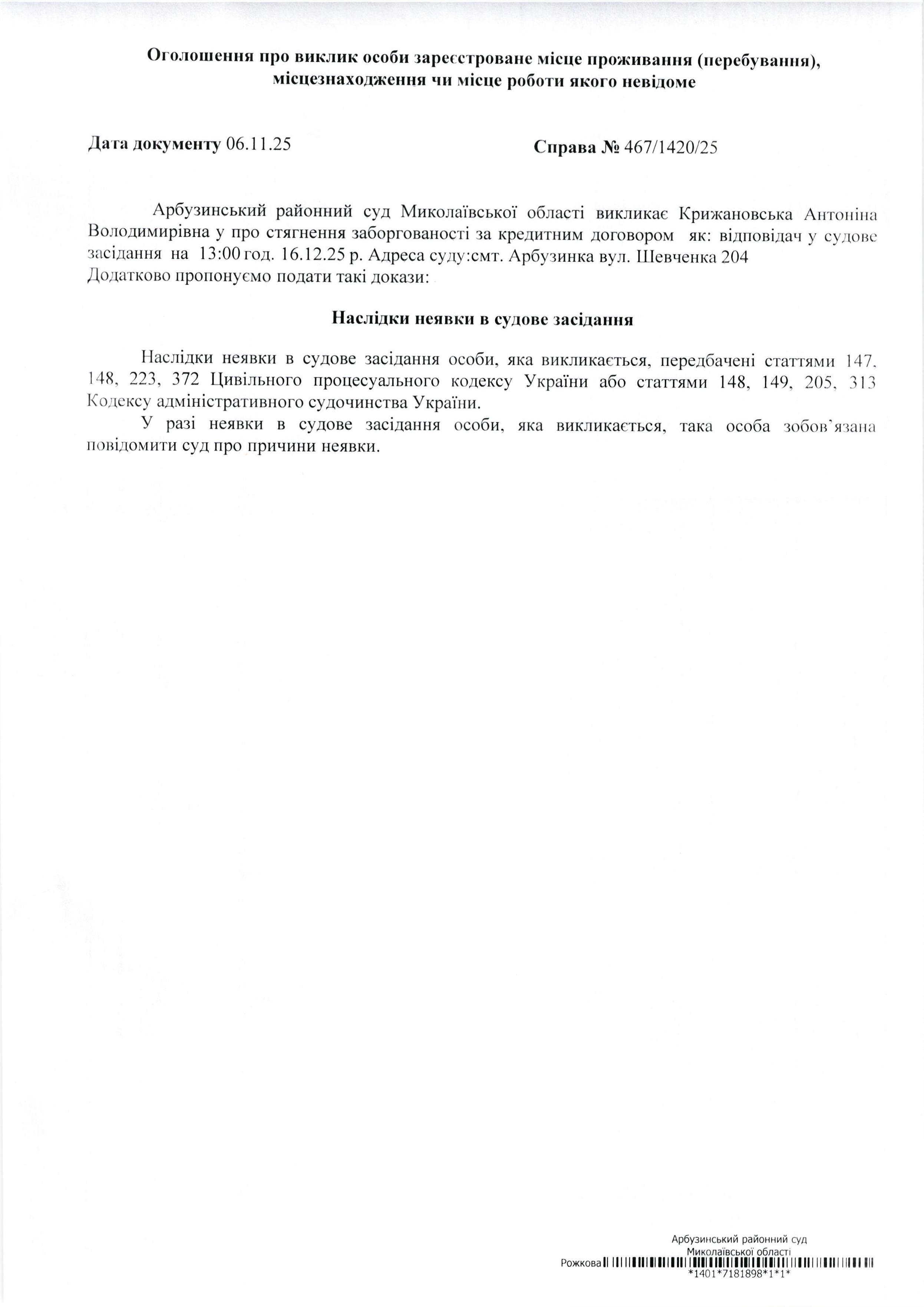Оголошення про виклик Крижановська Антоніна Володимирівна