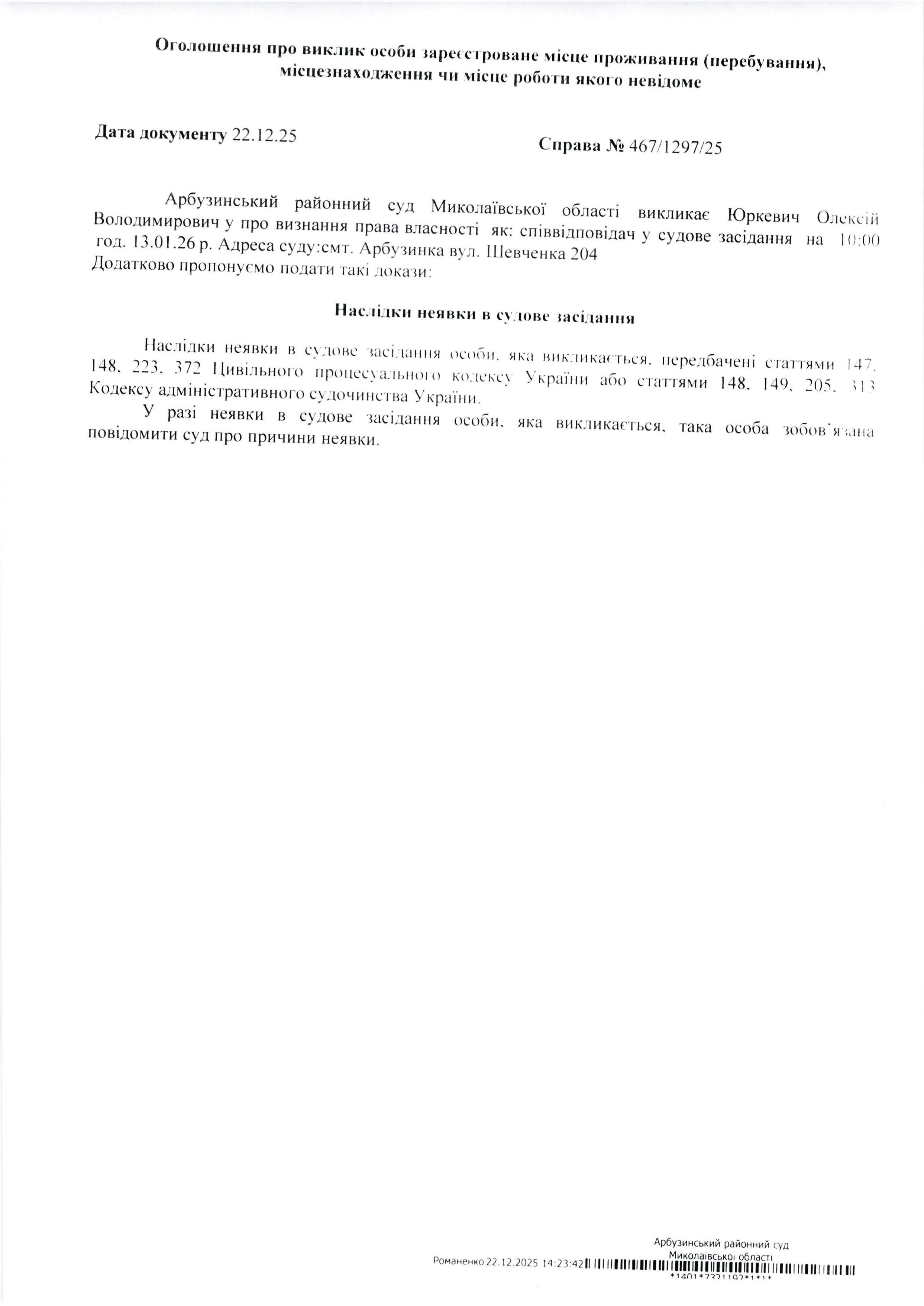 Оголошення про виклик Юркевич Олексій Володимирович