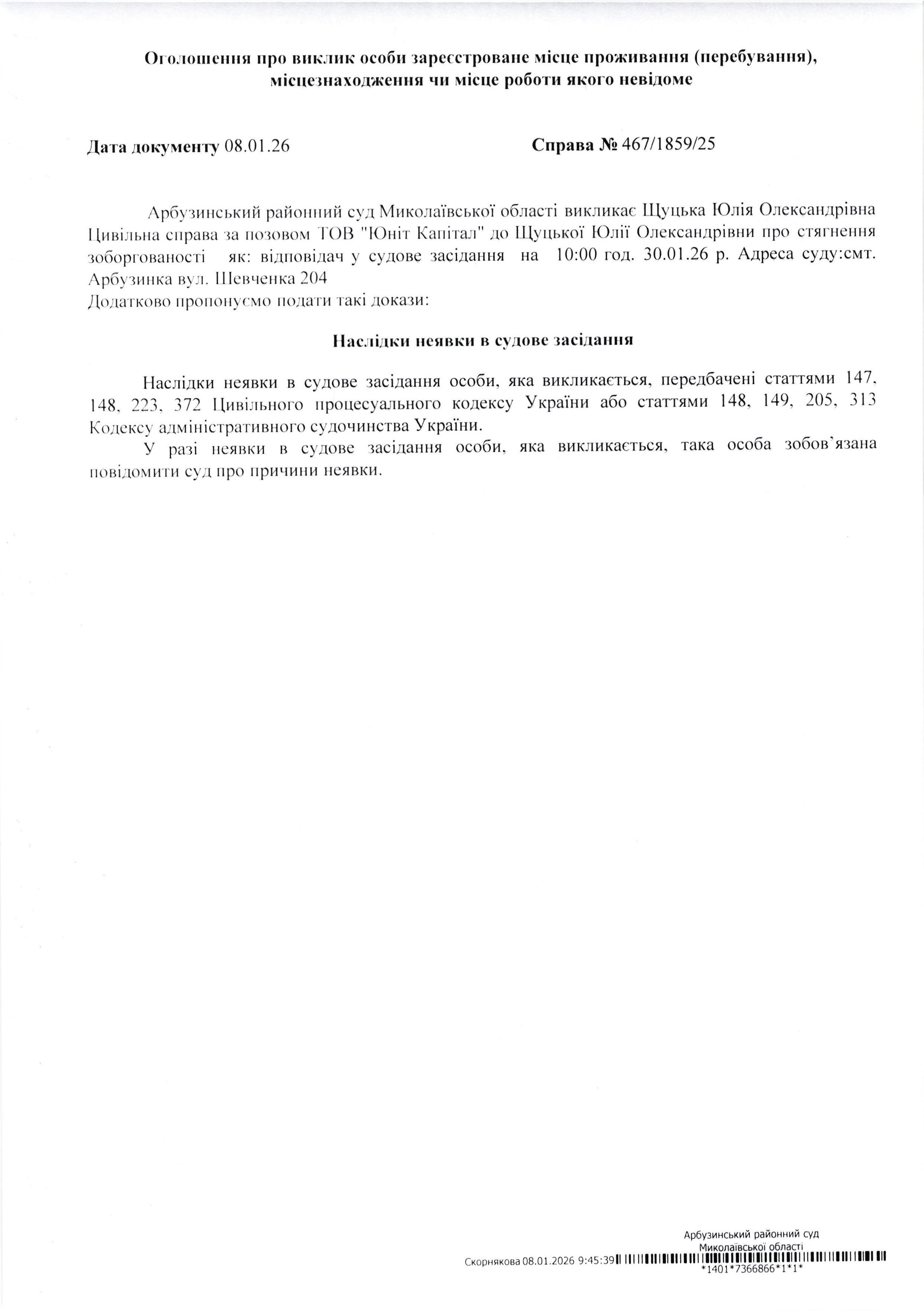 Оголошення про виклик Щуцька Юлія Олександрівна