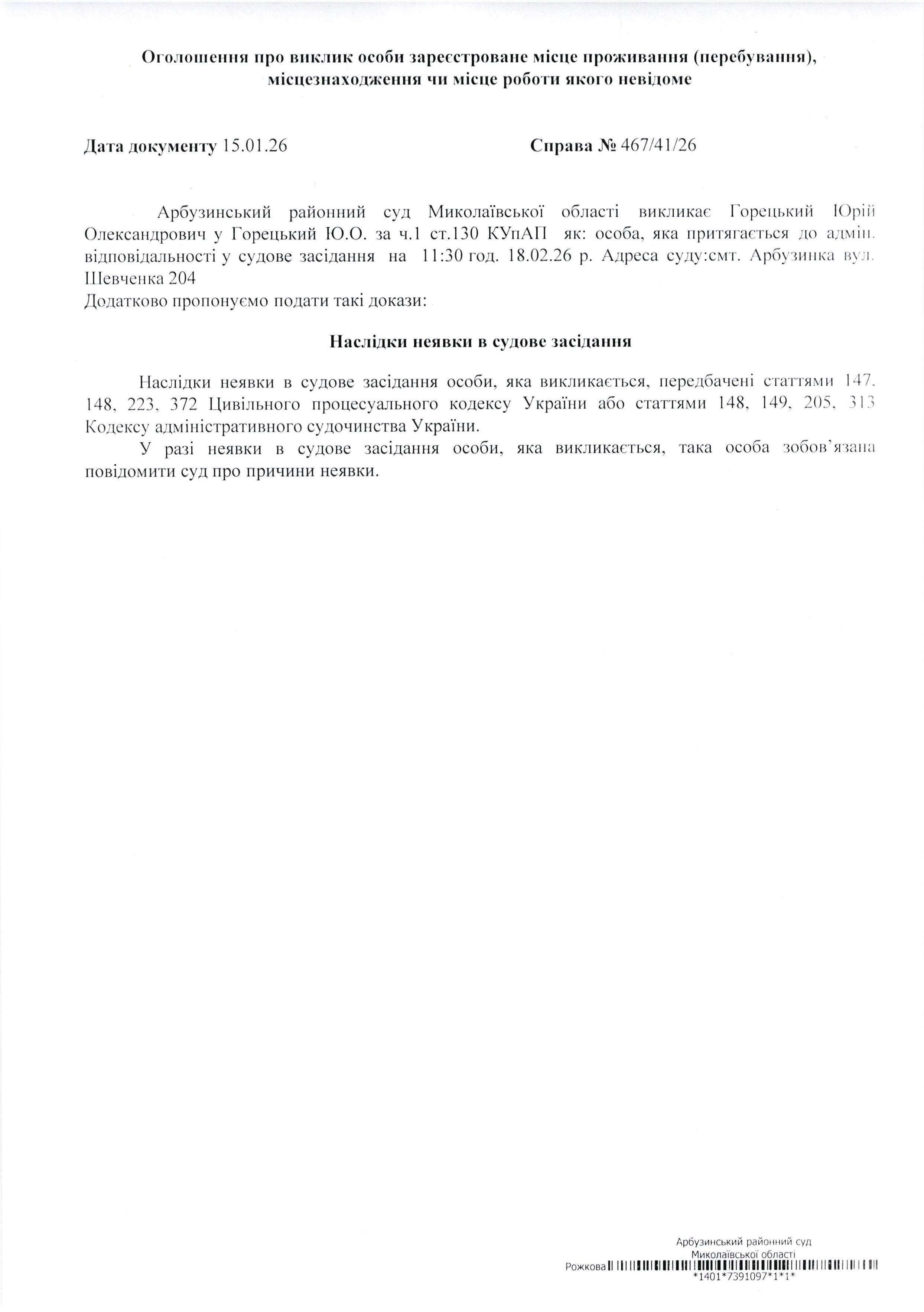 Оголошення про виклик Горецький Юрій Олександрович
