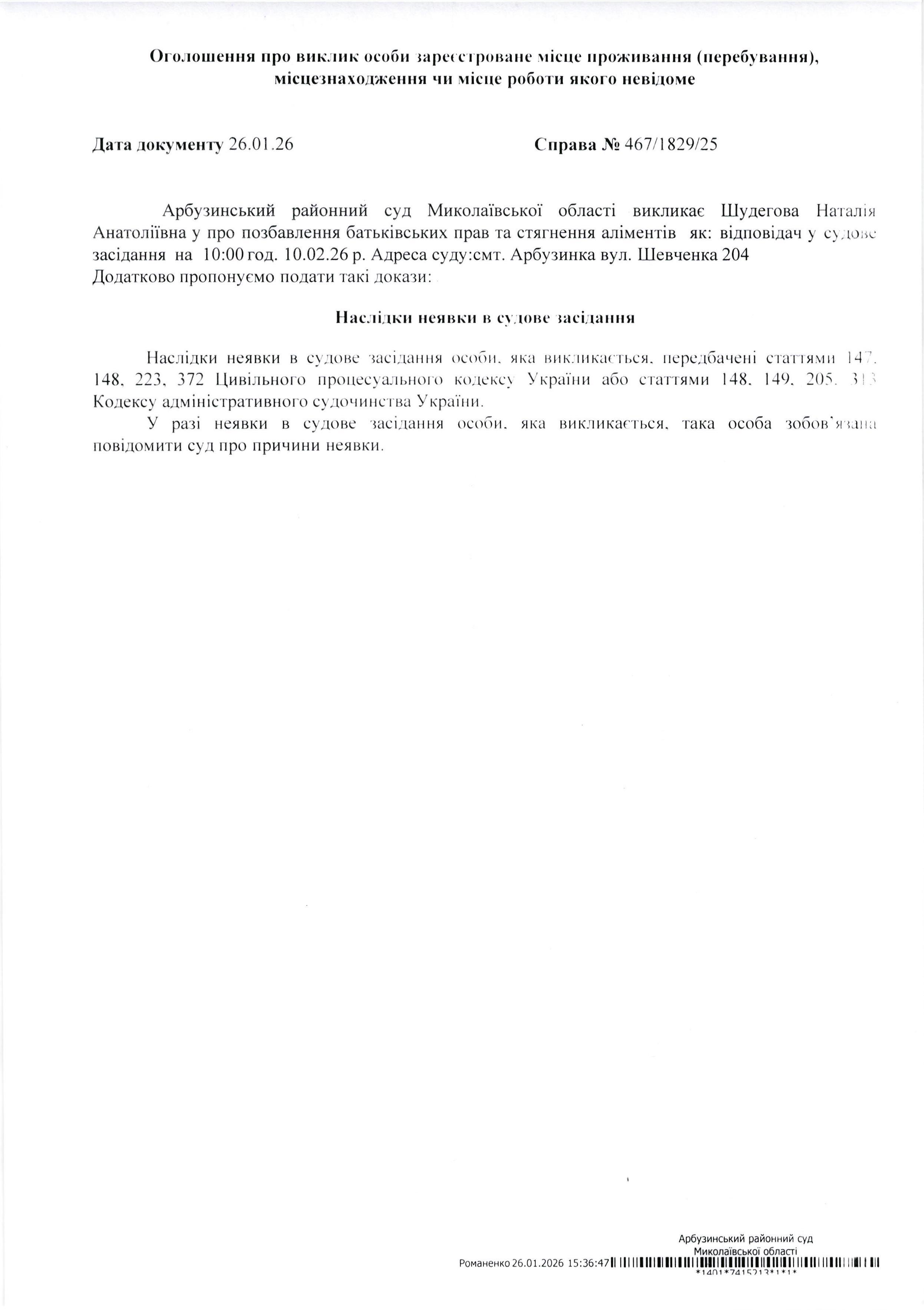 Оголошення про виклик Шудегова Наталія Анатоліївна