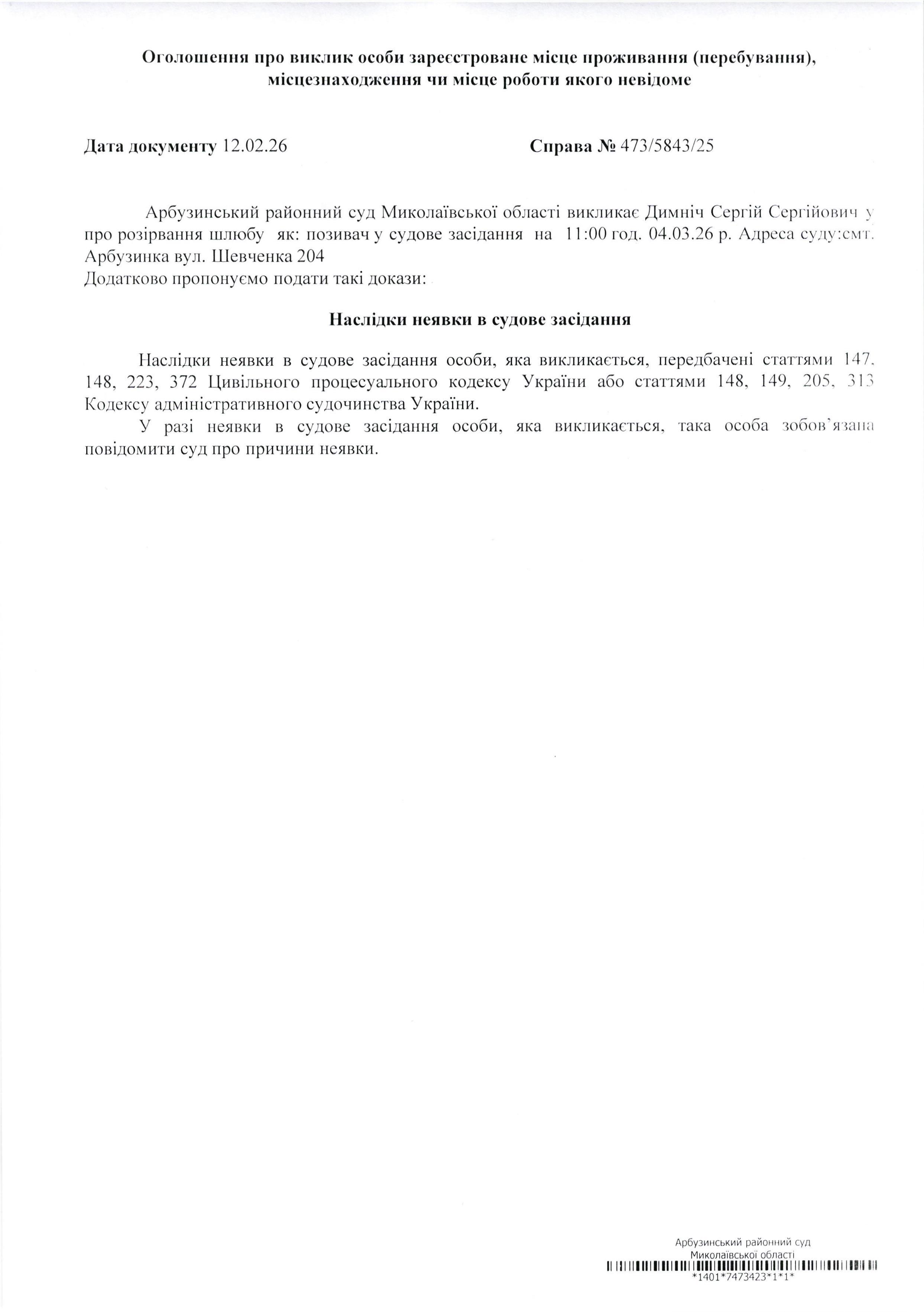 Оголошення про виклик Димніч Сергій Сергійович