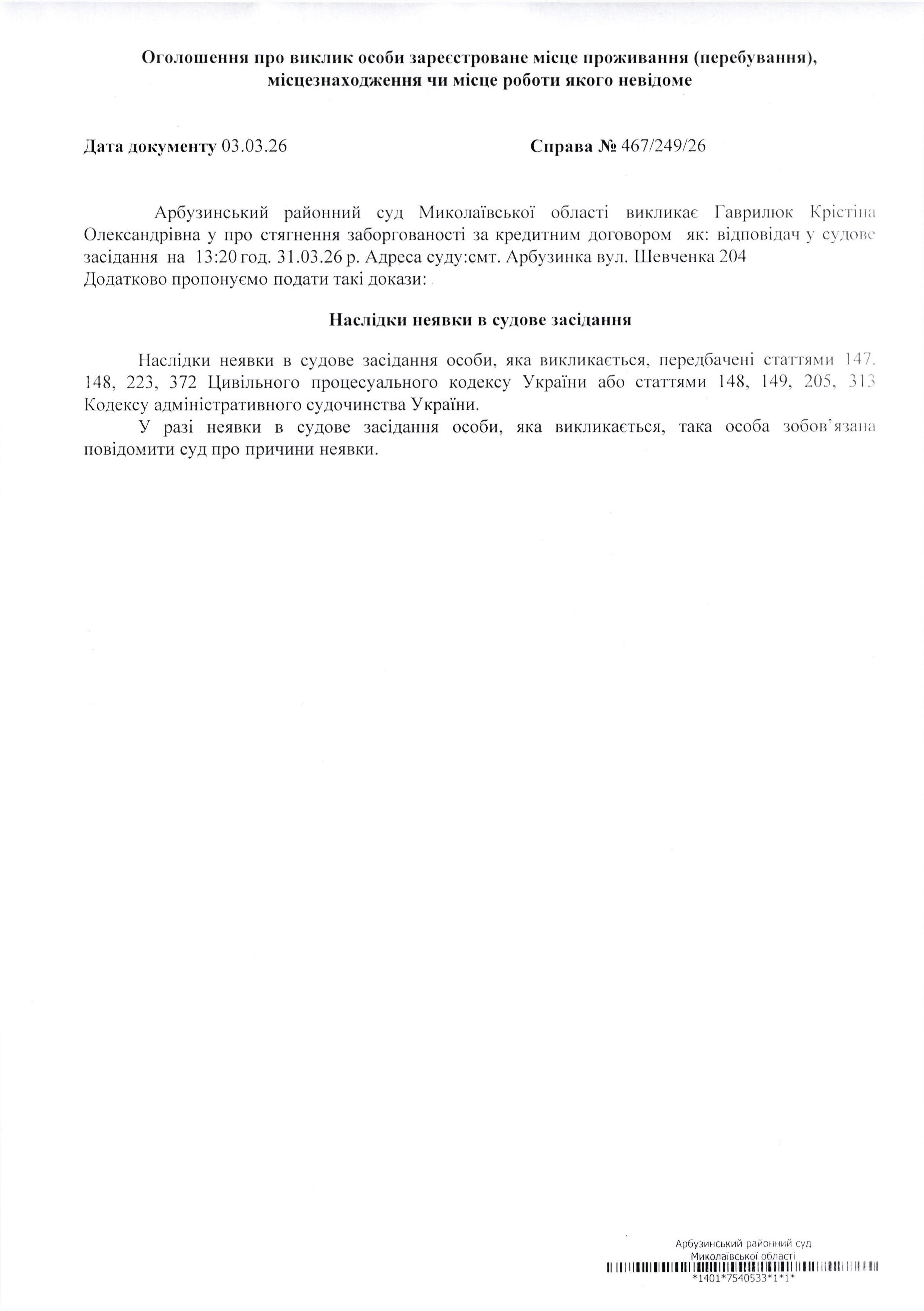 Оголошення про виклик Гаврилюк Крістіна Олександрівна