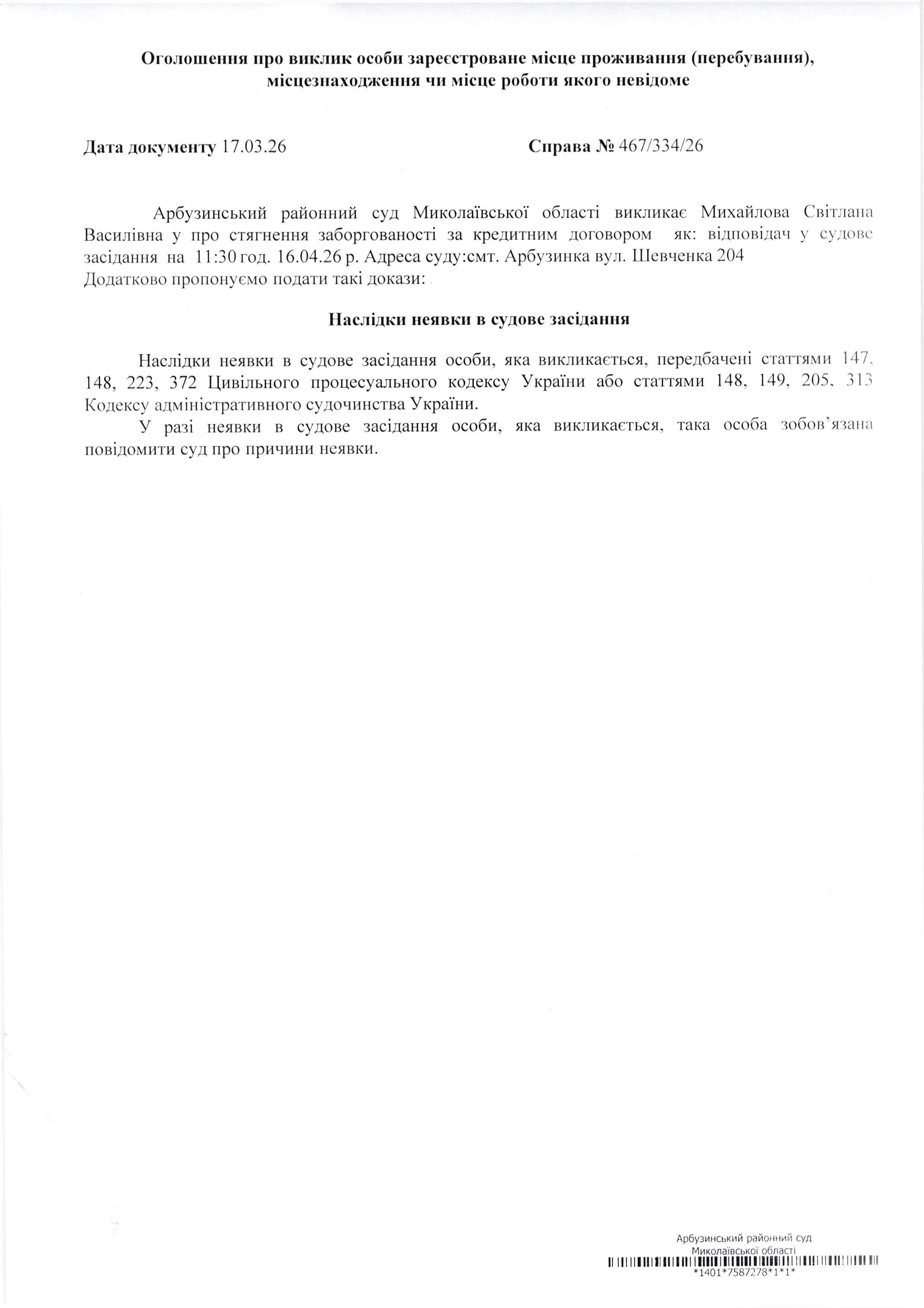 Оголошення про виклик Михайлова Світлана Василівна