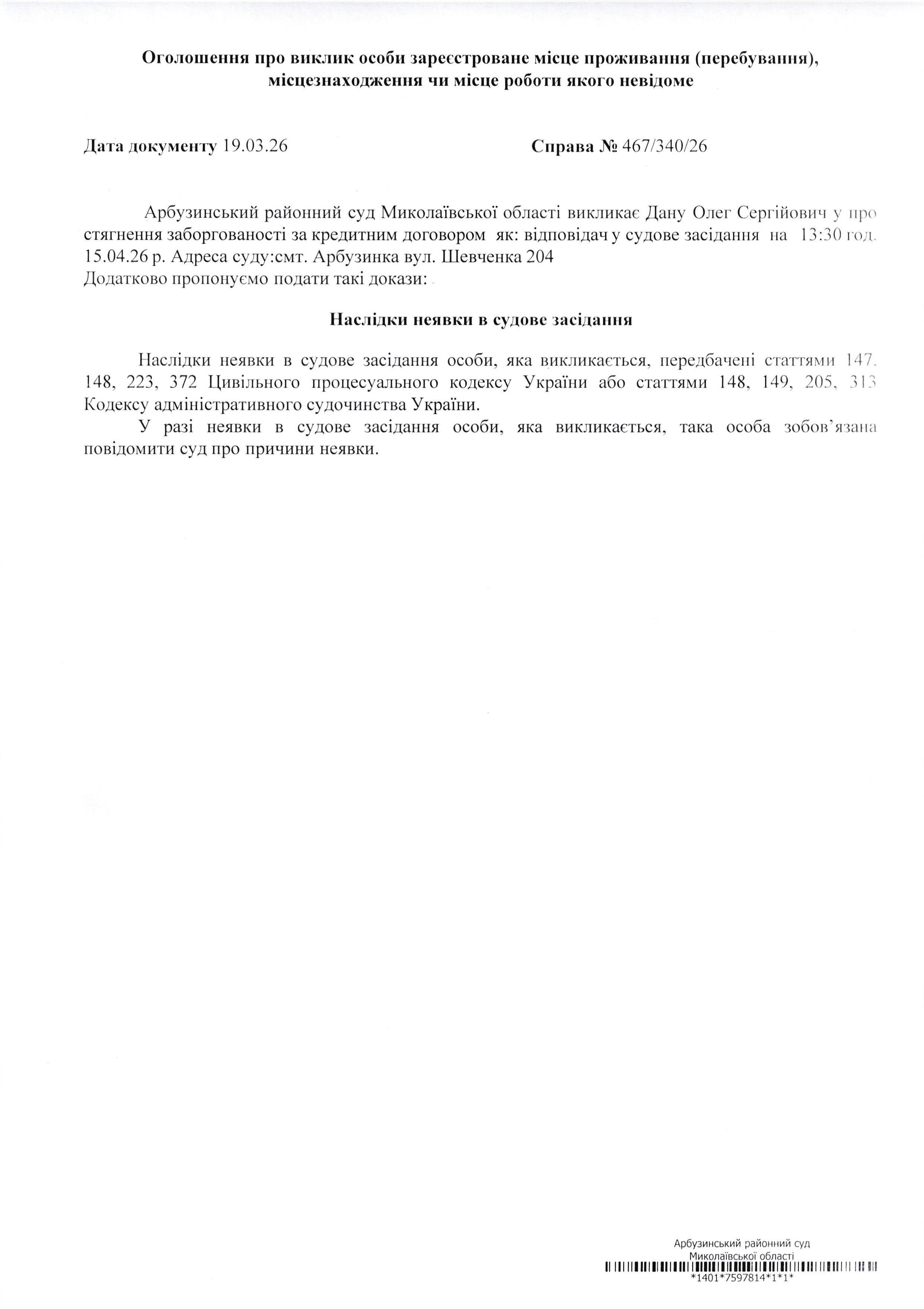Оголошення про виклик Дану Олег Сергійович