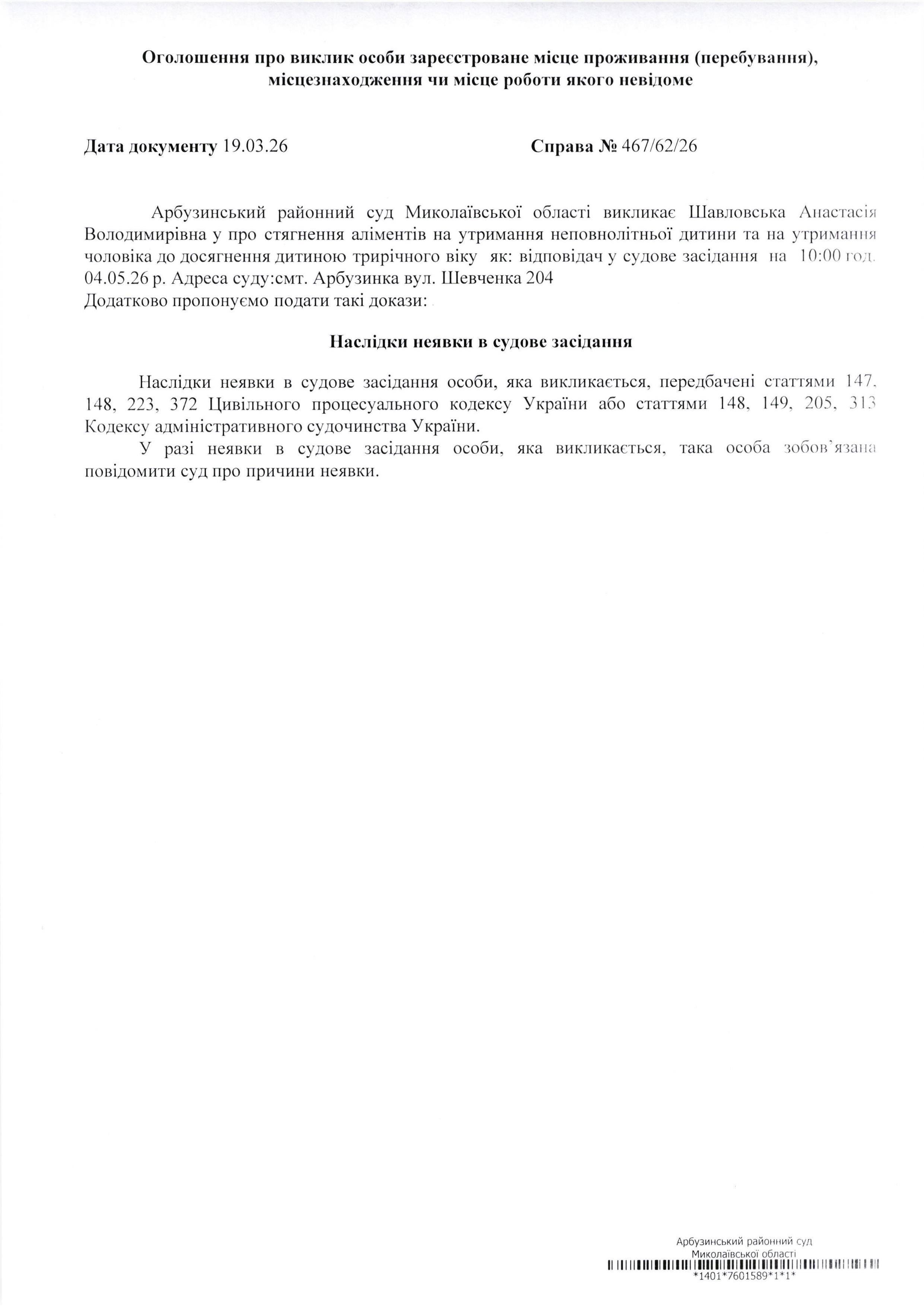 Оголошення про виклик Шавловська Анастасія Володимирівна