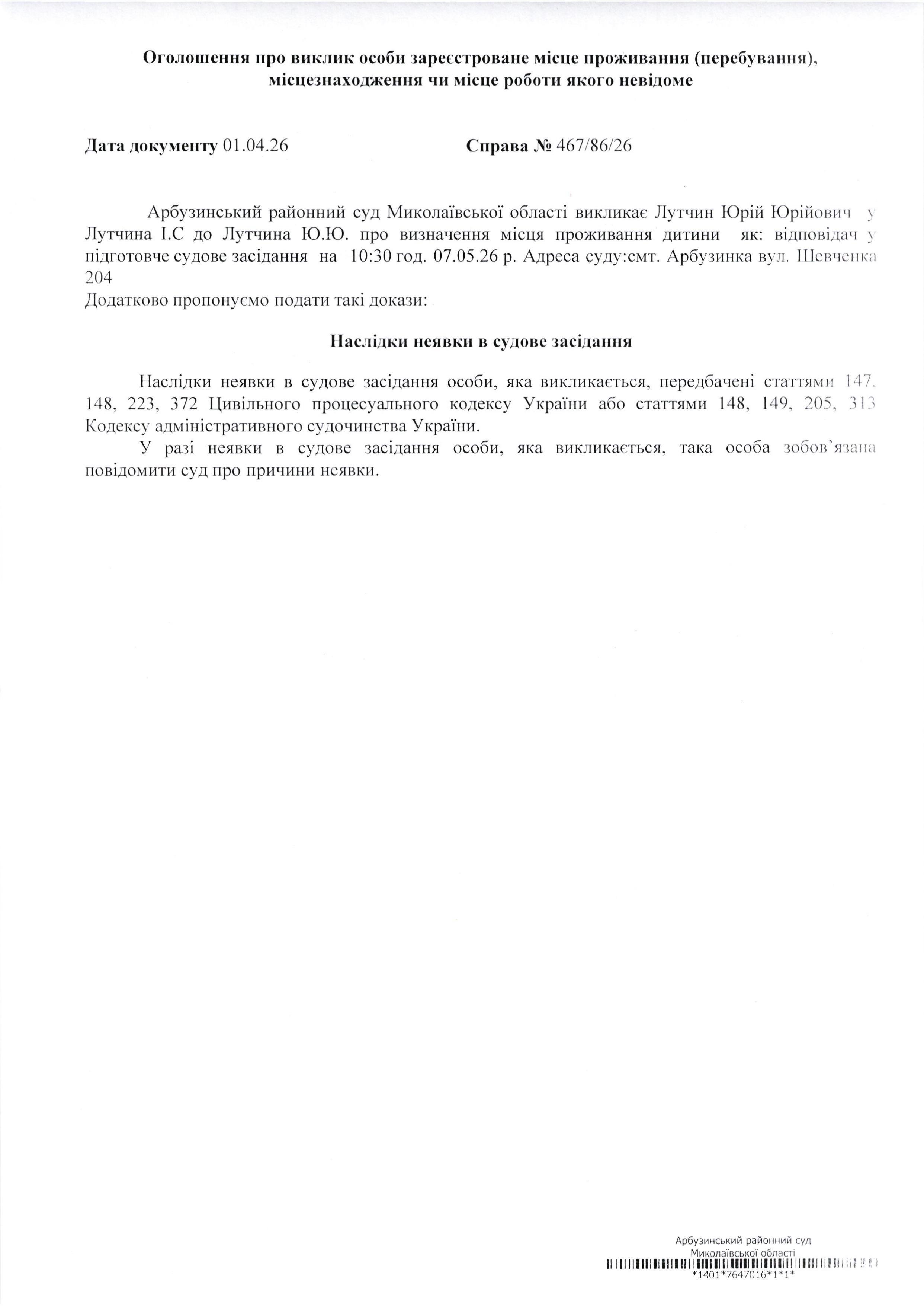 Оголошення про виклик Лутчин Юрій Юрійович
