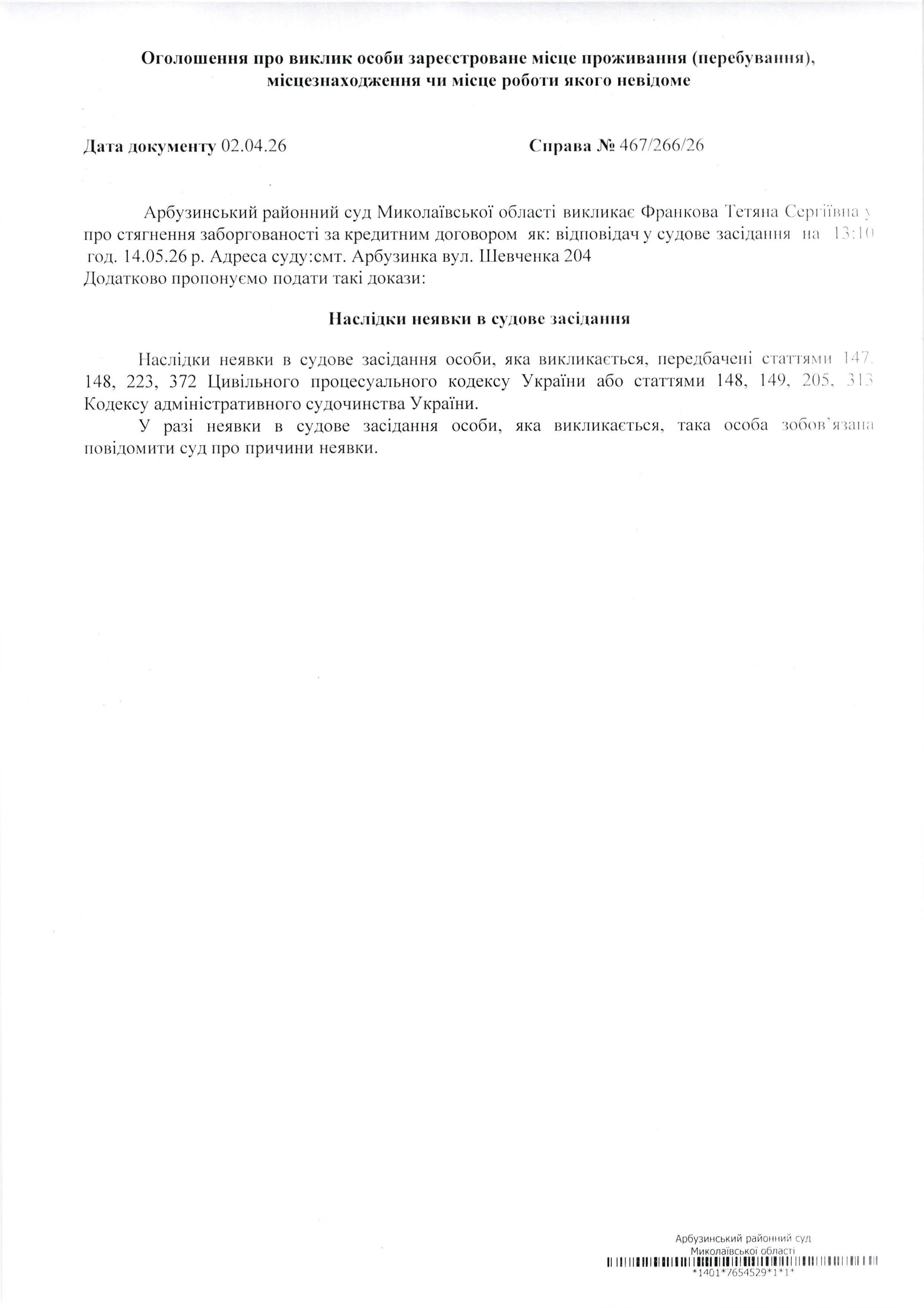 Оголошення про виклик Франкова Тетяна Сергіївна